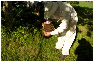 Staale checking to see if he could see the queen from the swarm .